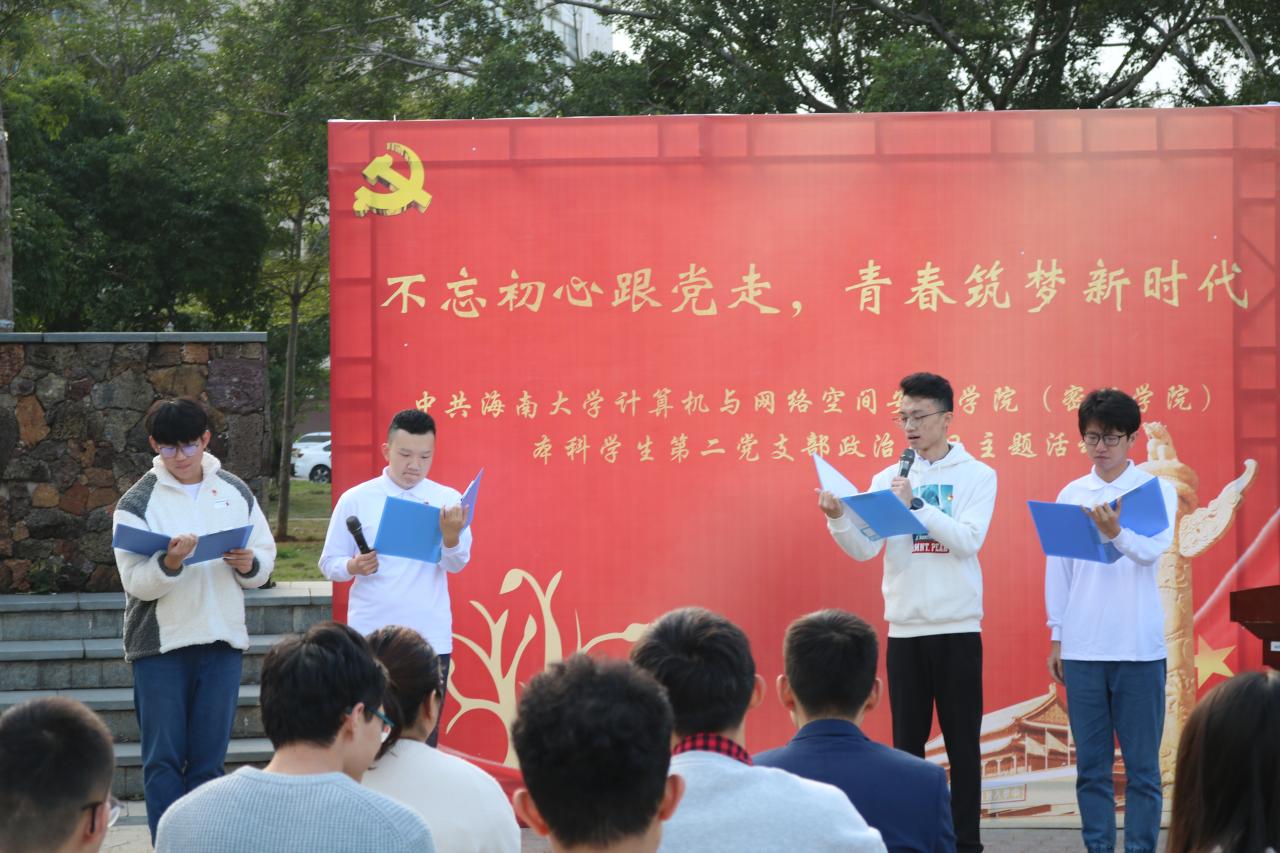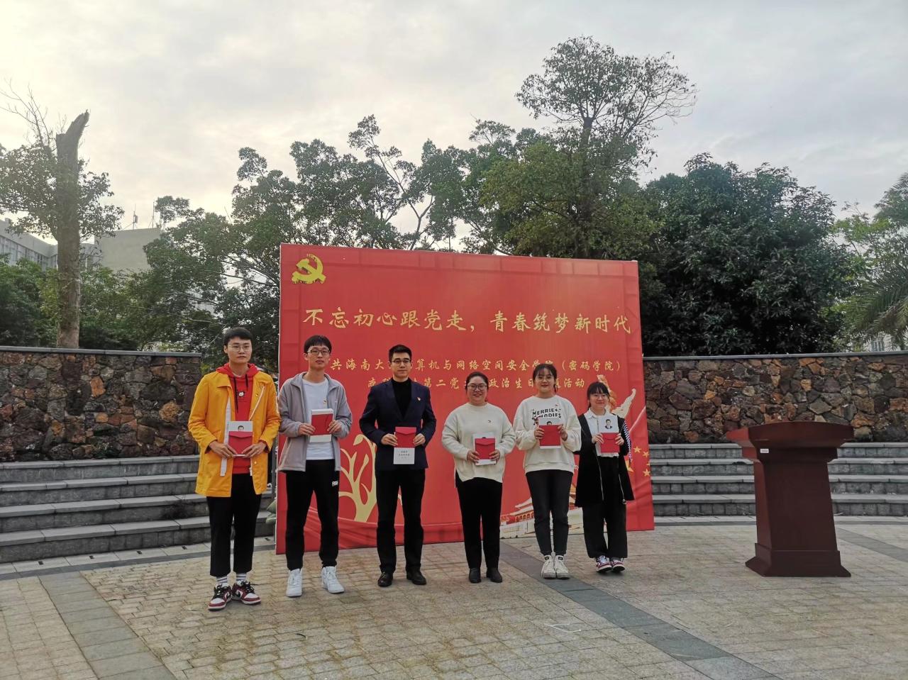 为充分发挥党组织的战斗堡垒作用和党员的先锋模范作用,强化党员宗旨意识,抒发党员爱党爱国情怀,2020年12月18日,计算机与yl6809永利集团(密码学院)本科学生第二党支部于青春记忆广场开展“不忘初心跟党走,青春筑梦新时代”政治生日主题活动。党支部书记黄苗苗、教师党员万隽、支部党员及入党积极分子代表参加本次活动。黄春早同志主持本次活动。