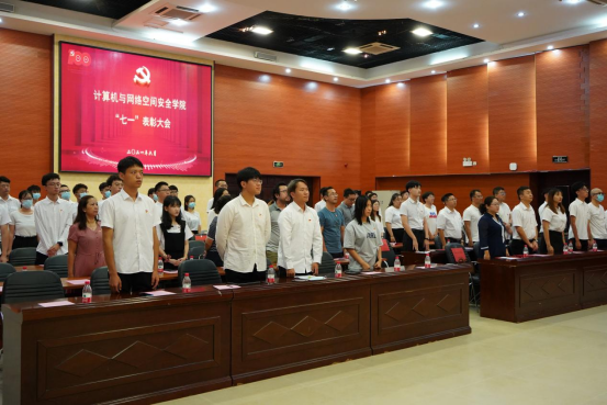 大会在庄严的国歌声中拉开了序幕,全体党员在鲜红的党旗下重温入党誓词。计算机科学与技术学院党务负责人王红英通报了学院获得校级“两优一先”的表彰名单,并宣读了学院党委表彰文件,对我院获奖的13名优秀共产党员、7名优秀党务工作者和3个先进党支部表示祝贺。