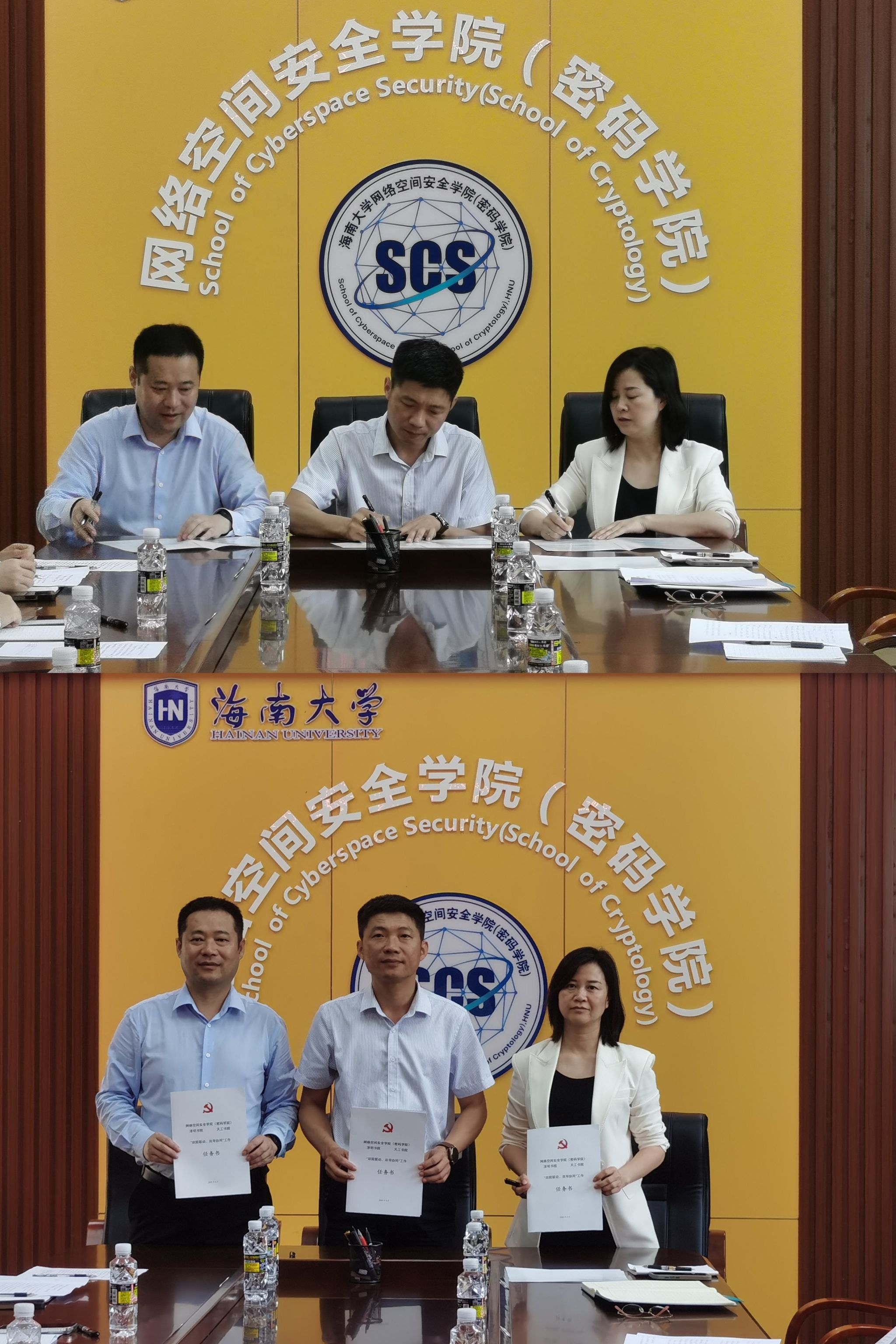 天工书院党委书记易振(左)、yl6809永利集团(密码学院)党总支书记陈广锐(中)、淳明书院党委书记周郭军(右)签订任务书