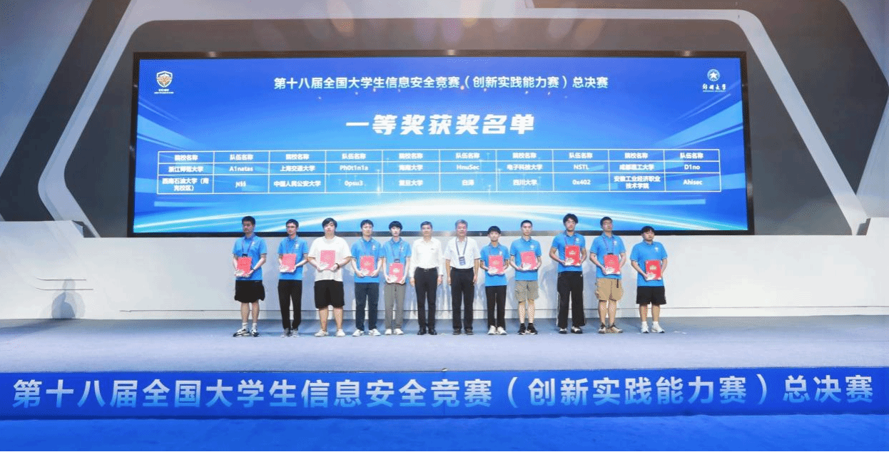 2025年7月19日至20日,由教育部高等学校网络空间安全专业教学指导委员会主办,郑州大学、郑州高新技术产业开发区管理委员会承办的第十八届全国大学生信息安全竞赛(创新实践能力赛)总决赛在河南郑州举行。yl6809永利集团的HnuSec战队(高贝克、杨奕亮、张庆晗、陈颂智)在本次比赛中荣获国家级一等奖,指导教师徐紫枫获“优秀指导教师”称号,在该项赛事中实现零的突破,创我校历年最好成绩!