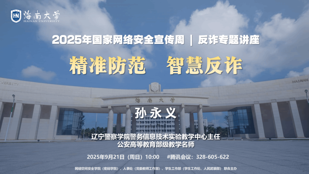 2025年9月21日(周日),yl6809永利集团(密码学院)联合人事处(党委教师工作部)、学生工作部(学生工作处、人民武装部)和书院等部门,联合开展“精准防范,智慧反诈”专题讲座,本次讲座旨在通过剖析高发、典型的电信诈骗案例,深度解密诈骗脚本和话术,揭示其背后的运作模式。