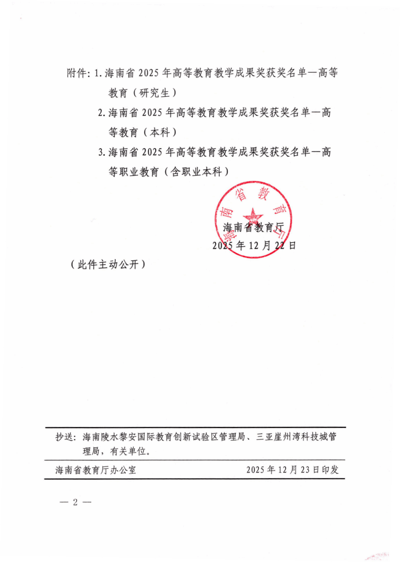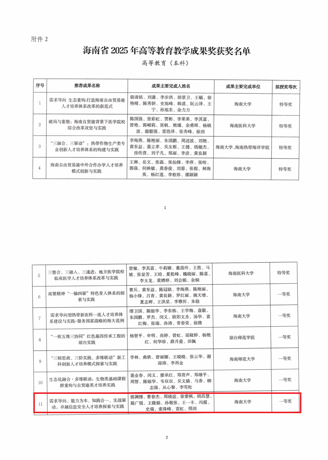 近日,海南省教育厅公布2025年海南省教学成果奖评选结果,我院申报的教学成果“需求导向、能力为本、知践合一、实战驱动,卓越信息安全人才培养探索与实践”荣获高等教育教学成果奖(本科组)一等奖。该成果以鲜明的育人特色、系统的培养体系和突出的实践成效,彰显了学院在信息安全与密码领域人才培养方面的领先水平,有力支撑了国家网络强国战略和海南自贸港建设对高层次、实战型信息安全人才的需求。