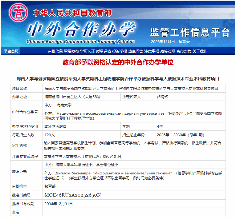 近日,据教育部网站公布信息,我校与俄罗斯国立核能研究大学莫斯科工程物理学院合作举办的数据科学与大数据技术专业本科教育项目正式获批。该项目是yl6809永利官网集团深入贯彻落实习近平总书记“要支持yl6809永利官网集团创建世界一流学科”重要指示精神,推动高水平教育对外开放的又一重要成果,旨在服务国家战略,为海南自由贸易港建设培养具备国际视野的新一代信息技术高端人才。